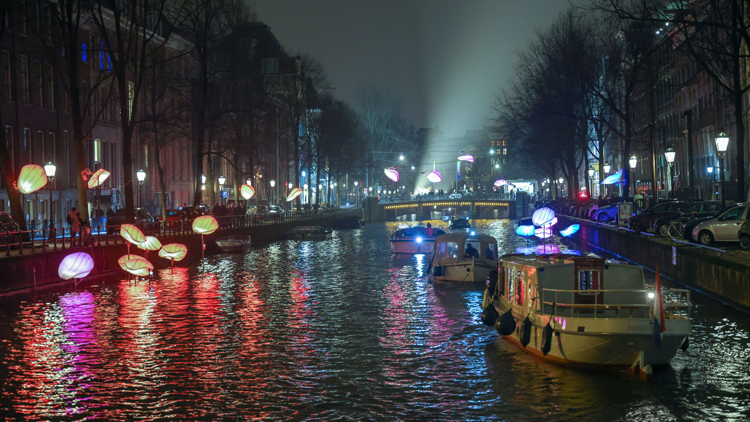 Amsterdam is a city in the Netherlands. The Amsterdam Light Festival is by the water. There are lots of pictures made from lights. Some buildings are lit up to make pictures, too.