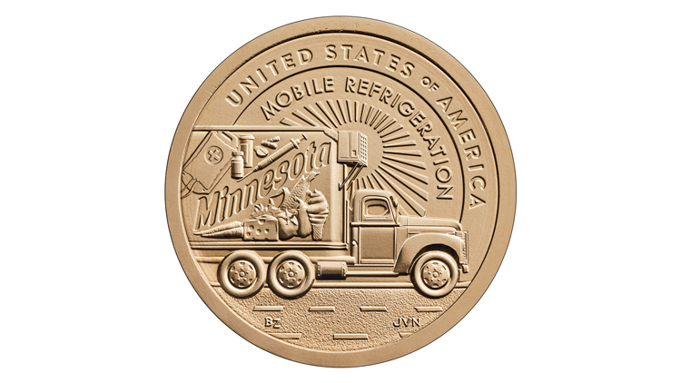 This coin celebrates the mobile refrigerator. Ice cream trucks use this kind of refrigerator. It was invented in Minnesota. The coin is part of a special design collection. The designs show inventors and inventions. They celebrate different states.
