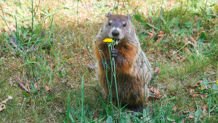 Groundhogs sleep while hibernating. Groundhogs come out of their burrows (a hole in the ground that animals live in). They do this in the spring. Then, they eat lots of food.