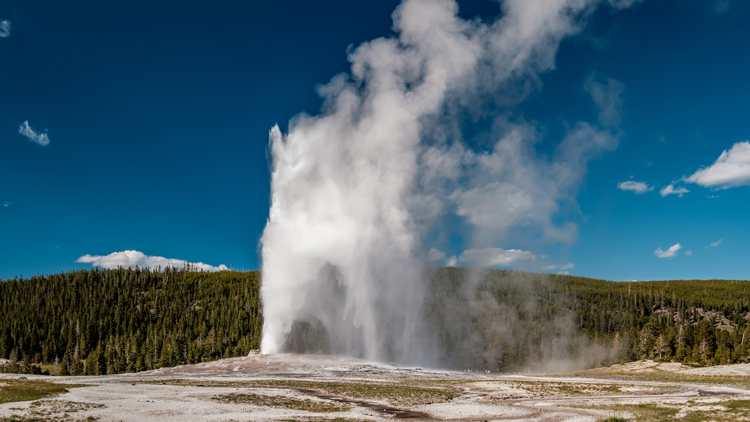 Wyoming is beautiful. This geyser is called “Old Faithful.” It erupts with water. Old Faithful is part of Yellowstone National Park. Wyoming has many parks and nature areas.