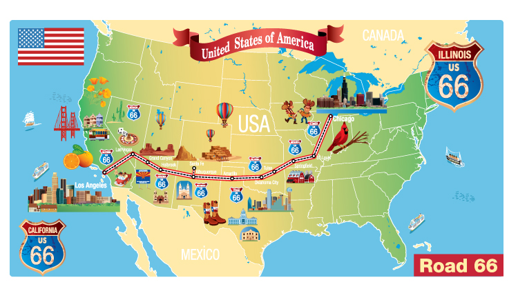 Route 66 starts in Chicago, Illinois. Route 66 goes all the way to Los Angeles, California. Route 66 crosses eight states. They are Illinois, Missouri, Kansas, Oklahoma, Texas, New Mexico, Arizona, and California. There are faster ways to travel today. Many people still prefer to drive on Route 66.