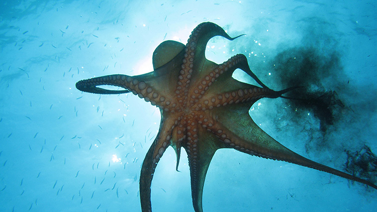 ¿Y si no logran confundirse con su entorno? Los pulpos liberan una nube de tinta negra. Esto hace que el depredador no pueda ver fácilmente. En ese momento el pulpo puede escapar. Toma agua y la expele como un chorro. ¡Así sale disparado a gran velocidad!