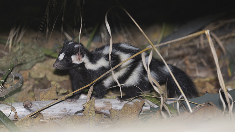 Las mofetas moteadas son mofetas pequeñas. Pesan alrededor de dos libras. Se alimentan de insectos y de huevos. También comen moras y raíces. Las mofetas moteadas son nocturnas (activas durante la noche).
