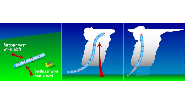 En algunas tormentas, el aire que sube y baja empieza a girar. A veces, este aire giratorio se desplaza bajo las nubes. Cuando esto sucede, puede formarse una nube embudo (una columna giratoria de gotitas de agua que desciende desde la base de una tormenta).