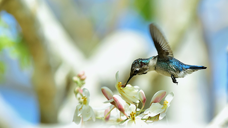 Los colibríes zunzuncitos se encuentran solamente en Cuba. Su nombre proviene del sonido que producen sus alas. A la gente les recuerda el sonido de los abejorros. Los colibríes zunzuncitos se alimentan del néctar (líquido azucarado que producen las plantas) de las flores. También se alimentan de insectos y de arañas.